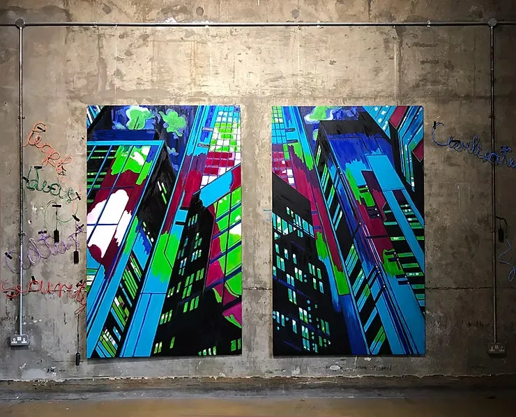 ‘Etemenanki Rises: a diptych’ oil on aluminium panel (120X200 cm) and neon light installation