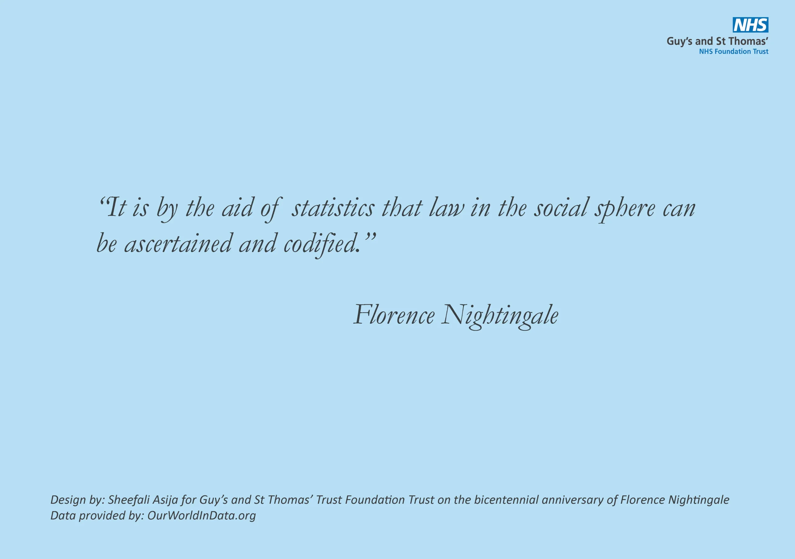 In 2020, to mark the bicentenary of Florence Nightingale’s birth, I created a set of postcards celebrating her pioneering role in data visualization. Nightingale was not only the founder of modern nursing but also one of the earliest practitioners of using visual statistics to influence public health and policy. Her conviction that “statistics is the most important science in the whole world” inspired me to create designsthat foreground her words alongside visual data.