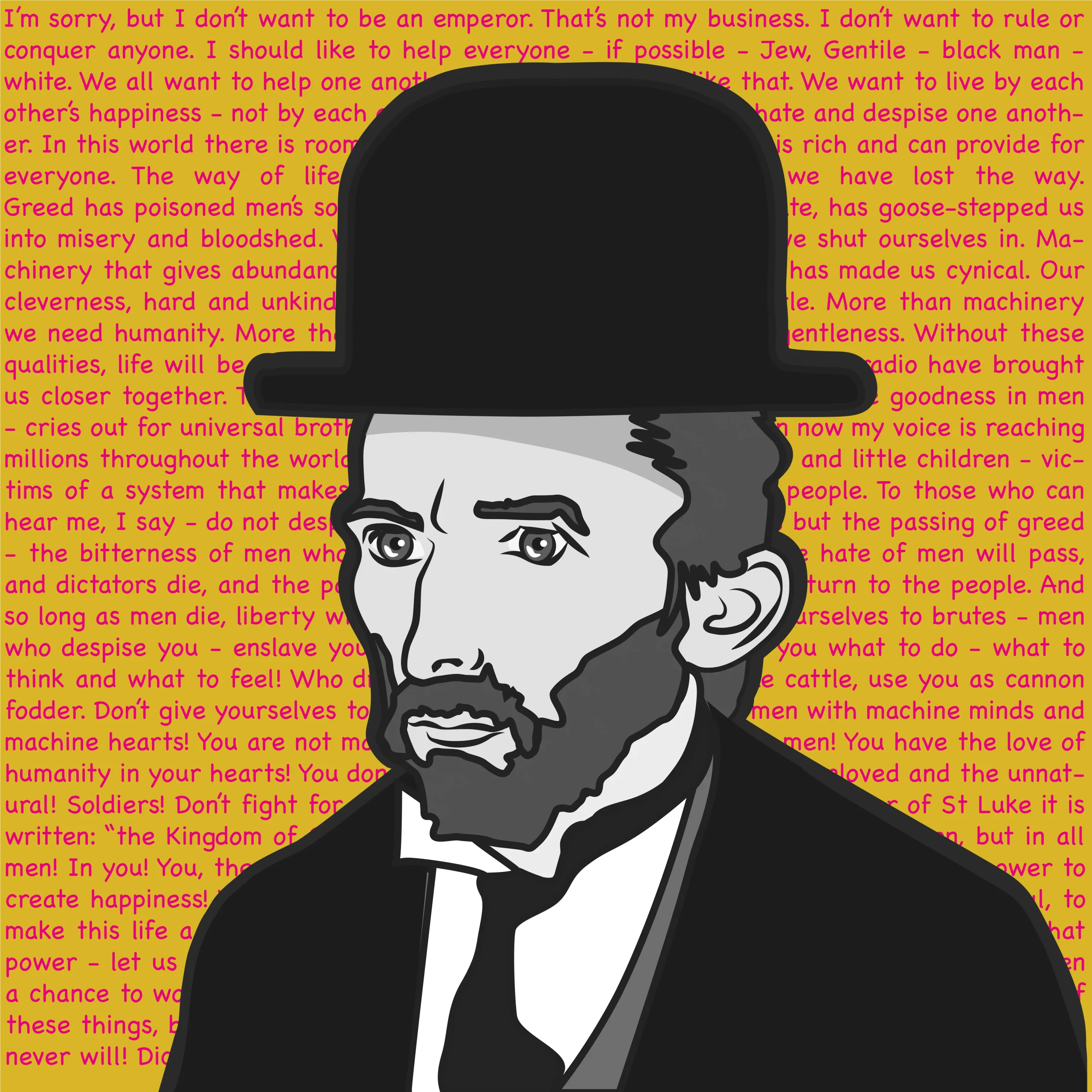 Among them is Sartorial Van Chaplin. I grew up adoring Chaplin’s films, and as I matured, I came to admire the man – a humanist who used satire to reveal the truths of human nature. His speech in The Great Dictator still moves me profoundly, every time I hear it. With humour and defiance, Chaplin turned Hitler from a figure of terror into an object of ridicule, showing how laughter can be resistance. By pairing van Gogh’s image with Chaplin’s voice and words, I wanted to highlight their shared belief in compassion, dignity, and human resilience – values that remain just as urgent today.